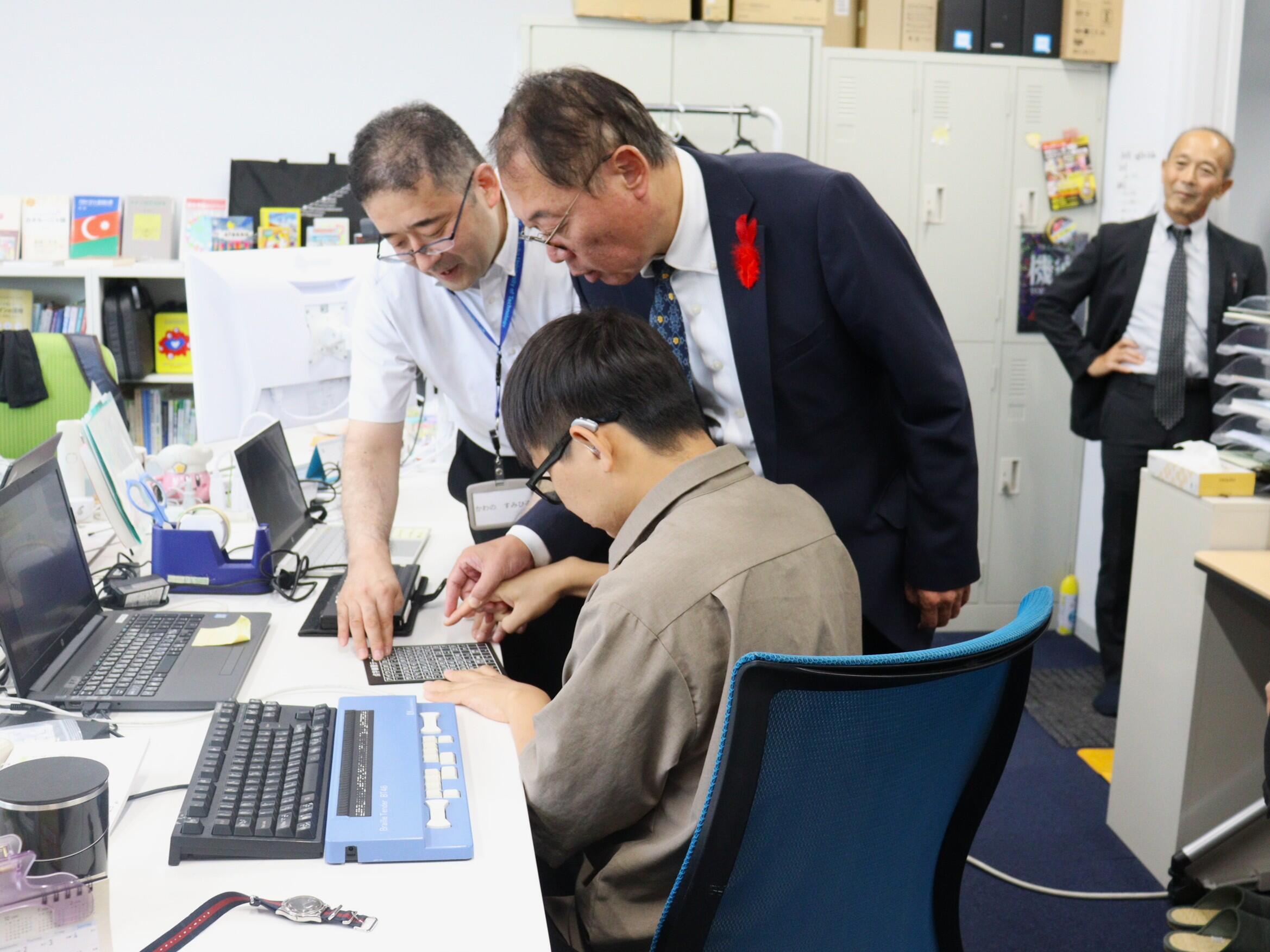 次に、リカレント教育および電話リレーサービスへの支援プロジェクトに携わる盲ろう職員の勤務状況を見学し、また、本学に事務局を置く日本聴覚障害学生高等教育支援ネットワーク(PEPNet-Japan)における取組をご覧いただきました。